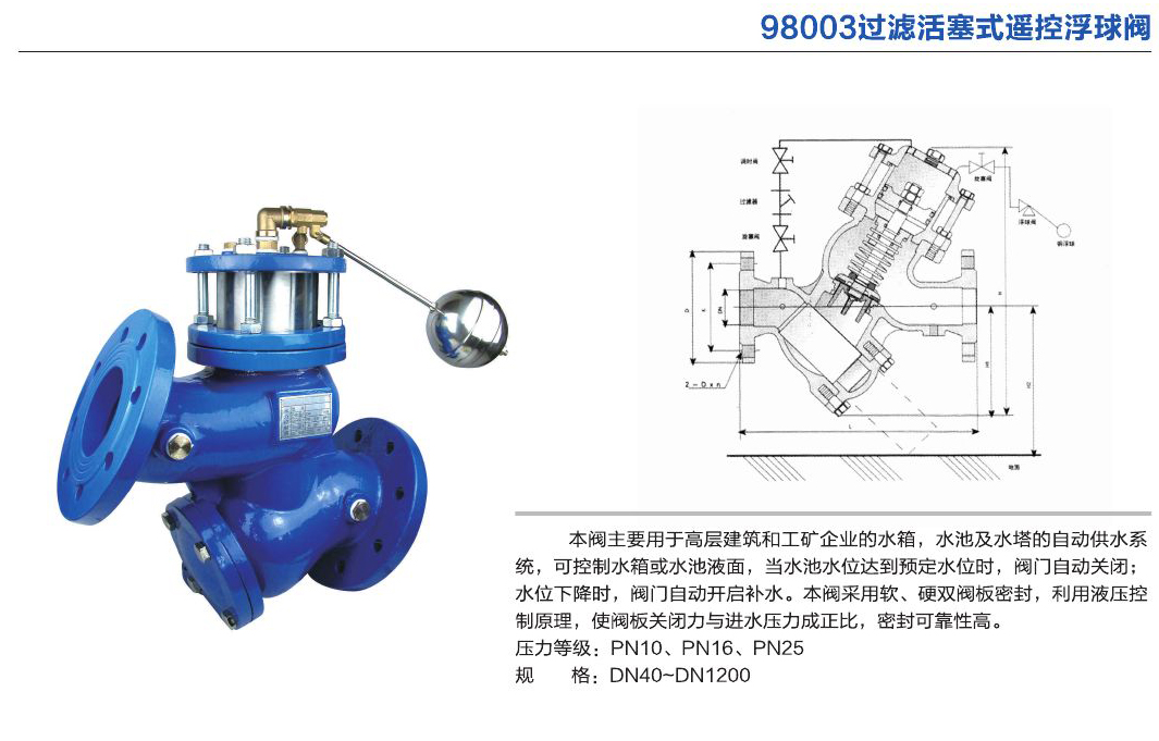 - 主要用于高層建筑和工礦企業(yè)的水箱,水池及水塔的自動供水系統(tǒng),可控制水箱或水池液面,當(dāng)水池水位達(dá)到預(yù)定水位時(shí),閥門自動關(guān)閉,水位下隆時(shí),閥門自動開啟補(bǔ)水。