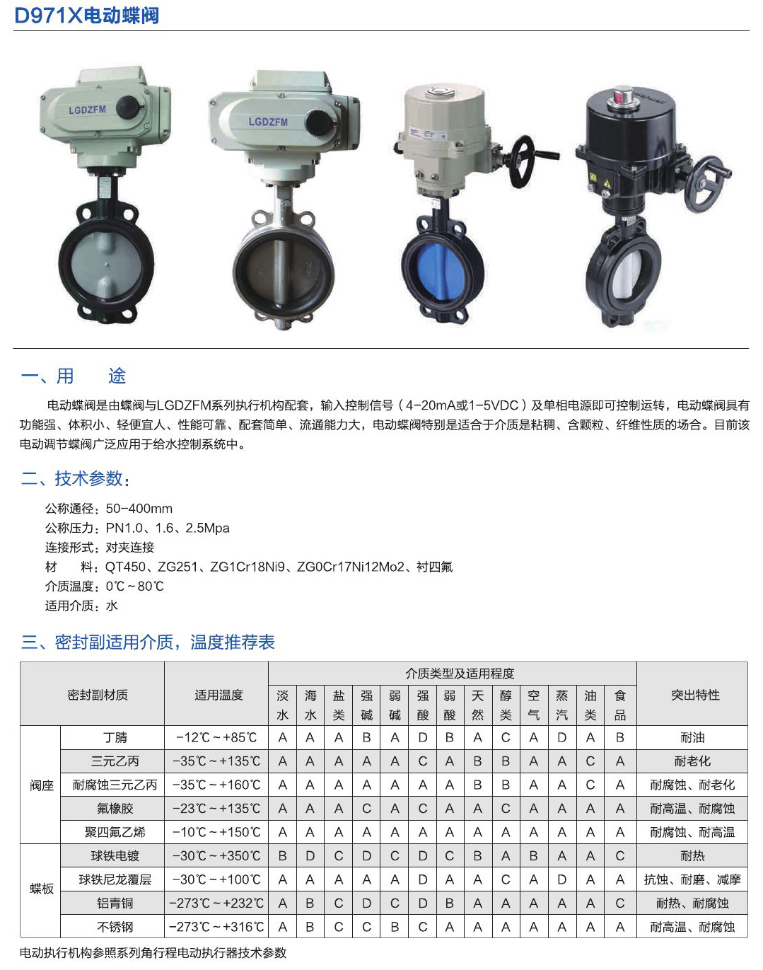 - 電動蝶閥是由蝶閥與LGDZFM系統執行機構配套,輸入控制信號(4-20mA或1-5VDC)及單相電源即可控制運轉,電動蝶閥具有功能強、體積小、輕便宜人、性能可靠邊、配套簡單、流通通力大,電動蝶閥特別是適合于介質是粘稠、含顆粒、纖維性質的場合。