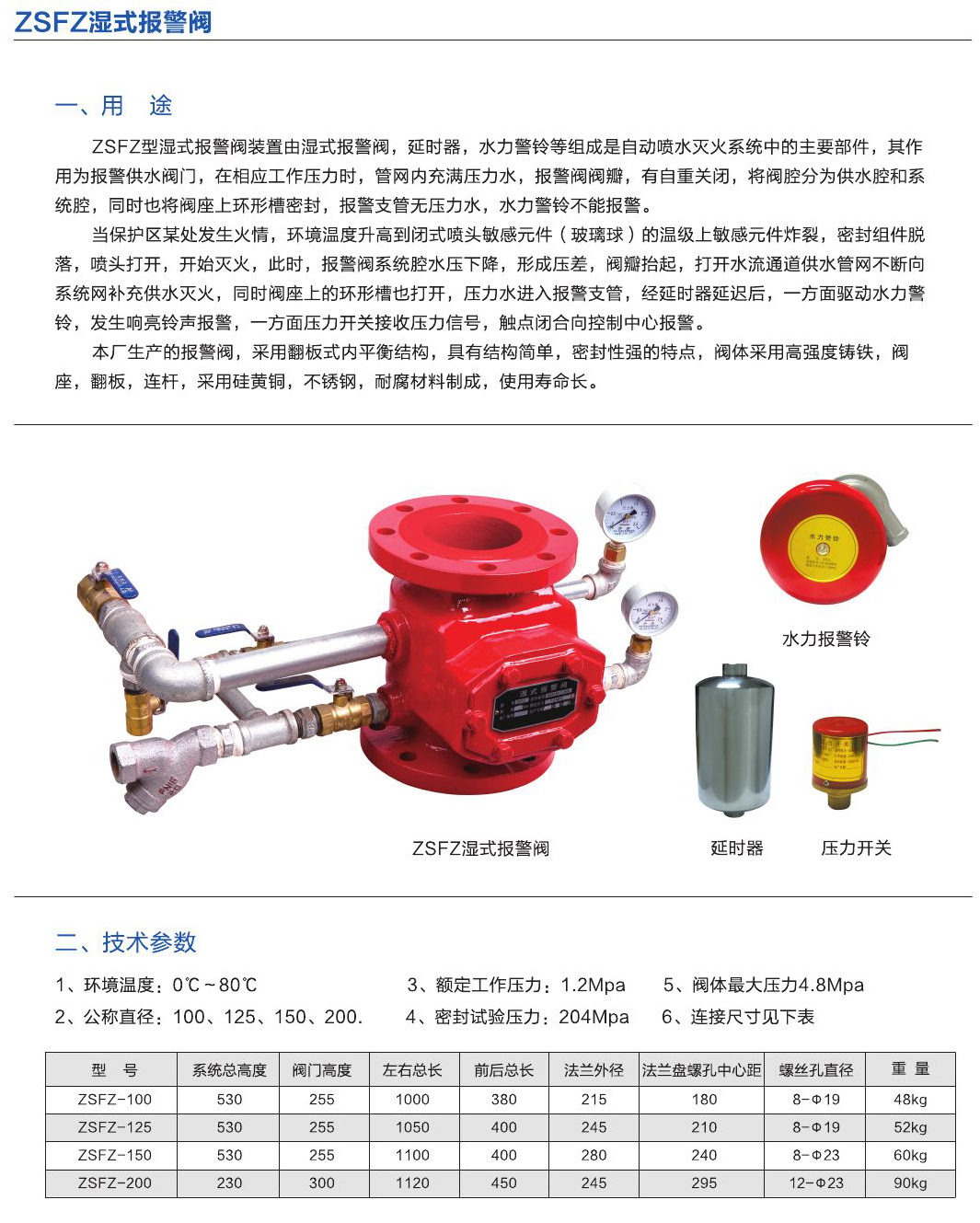 - ZSFZ型濕式報(bào)警閥裝置由濕式報(bào)警閥,延時器,水力警鈴等組成是自動噴水滅火系統(tǒng)中的主要部件,其作用為報(bào)警供水閥門,在相應(yīng)工作壓力時,管網(wǎng)內(nèi)充滿壓力水,報(bào)警閥閥瓣,有自重關(guān)閉,將閥腔分為供水腔和系統(tǒng)腔,同時也將閥座上環(huán)形槽密封,報(bào)警支管無壓力水,水力警鈴不能報(bào)警。