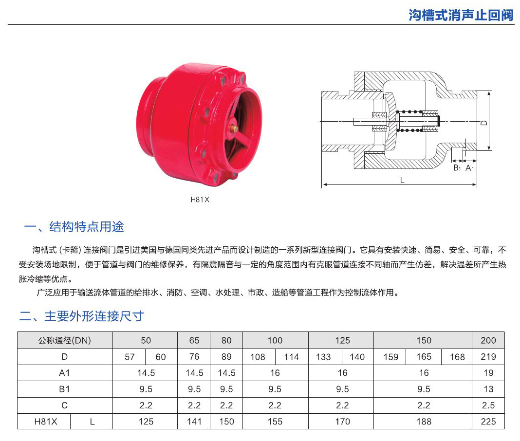 - 溝槽式(卡箍)連接閥門是引進美國與德國同類先進產品而設計制造的一系列新型連接閥門。它具有安裝快速、簡易、安全、可靠、不受安裝場地限制、便于管道與閥門的維修保養。有隔振隔音與一定的角度范圍內有克服管道連接不同軸而產生仿差,解決溫差所產生熱賬冷縮等優點。